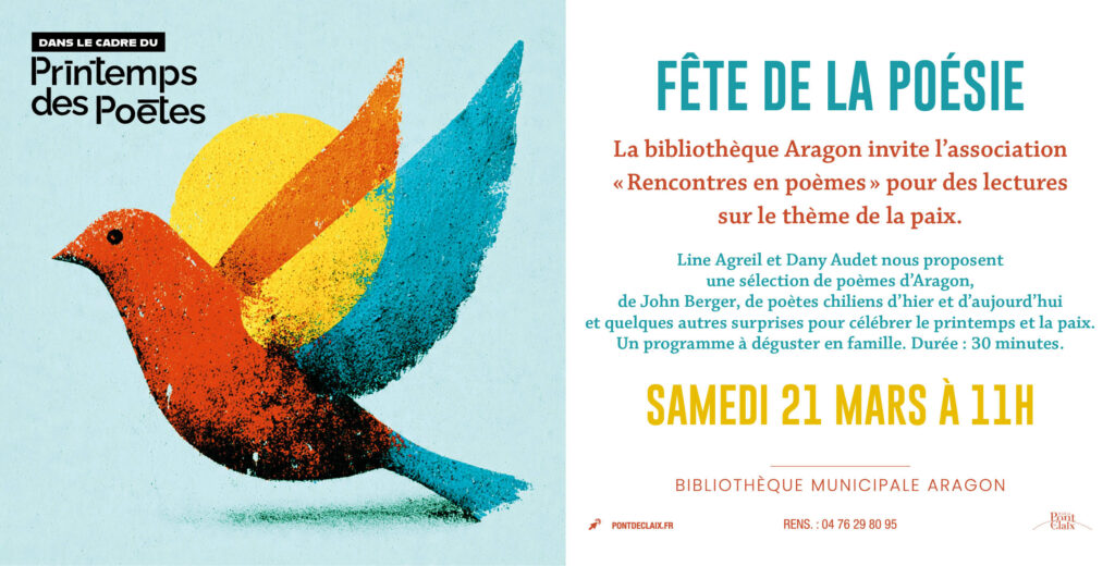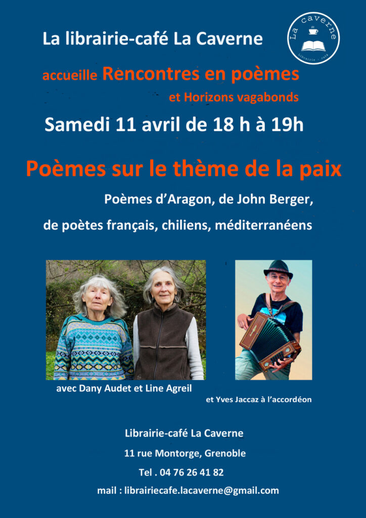 Tour in the Alps (FR) – Line Agreil and Dany Audet with their association « Rencontres en poèmes » proposent lectures of John Berger’s poems. Other lectures mix John Berger’s poems with others authors, Mediterraneans (Ghayda Al Hadj Hussein, Mohamed Aouine, Mahmoud Darwich), French (Jean Tardieu, Jacques Prévert, Louis Aragon, Ana Luna Fédèle and Chilean (Manuel Silva Acevedo, Pablo Neruda).